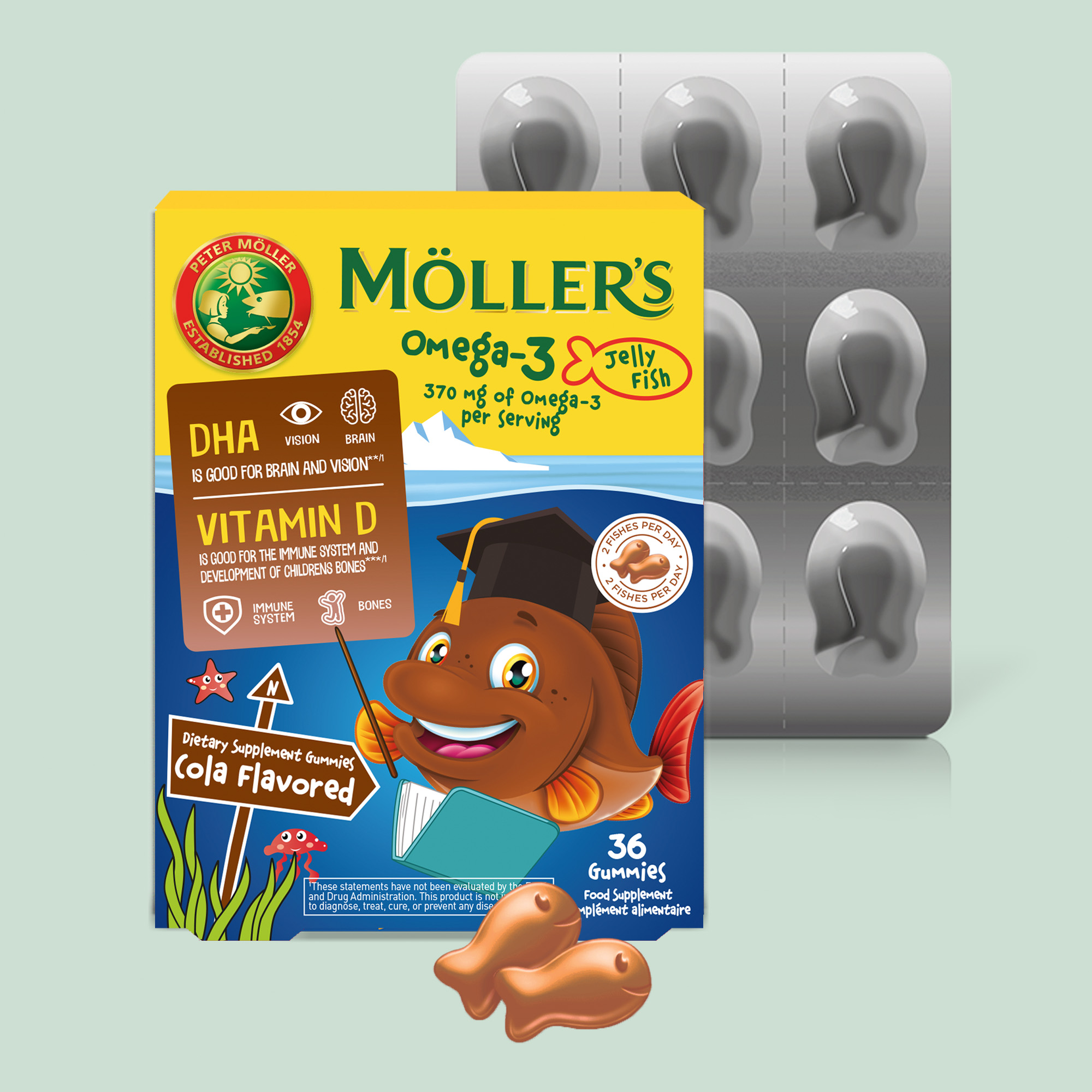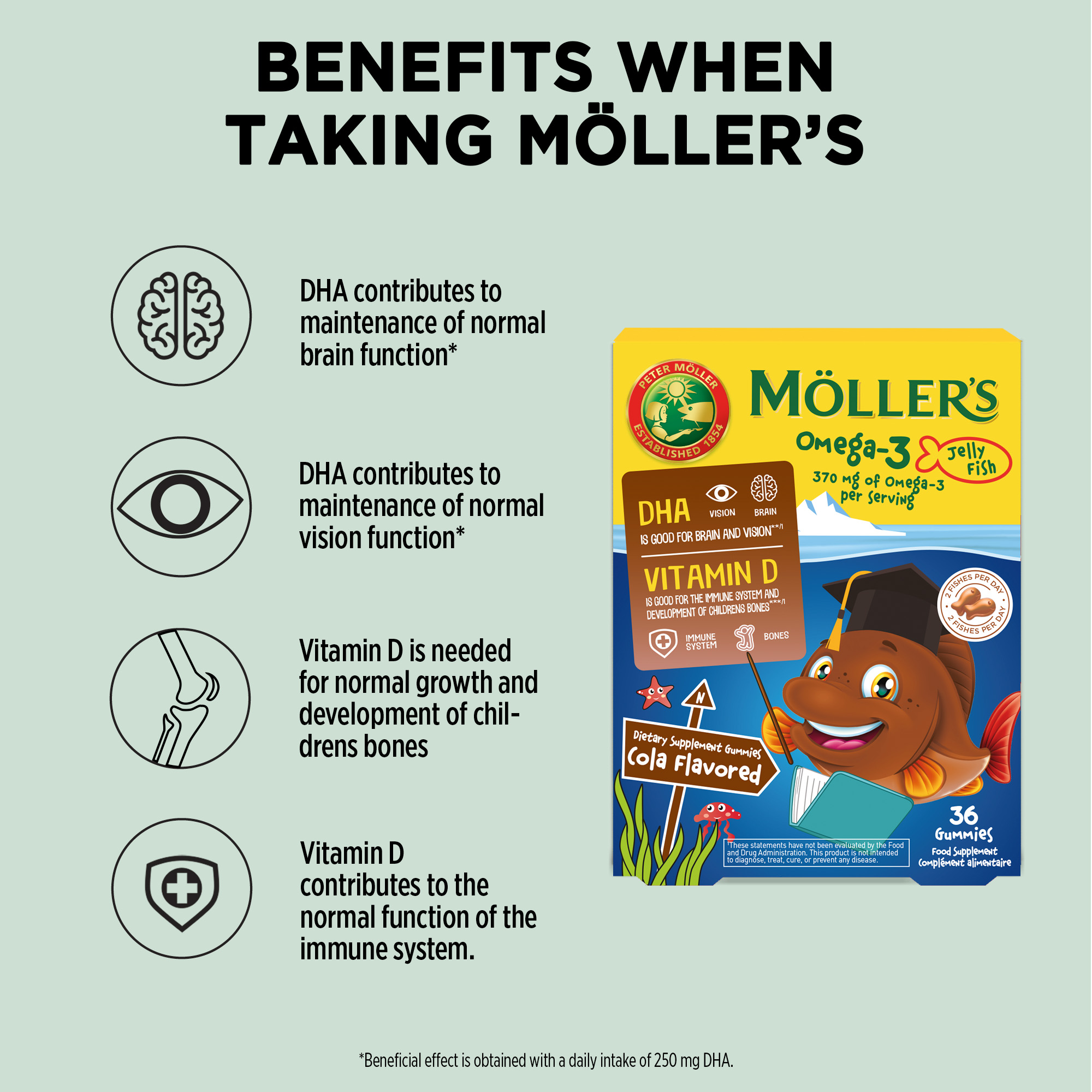 Kapsula Xhelatinoze Möller’s Omega-3 me shije kola përmbajnë acide yndyrore omega-3, të cilat ndihmojnë në ruajtjen e funksionit normal të trurit dhe të shikimit. Përmban gjithashtu vitaminë D, e cila kontribuon në funksionimin normal të sistemit imunitar dhe është e nevojshme për rritjen dhe zhvillimin normal të kockave tek fëmijët.